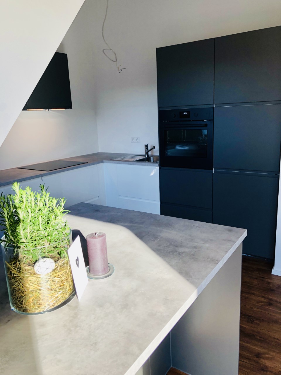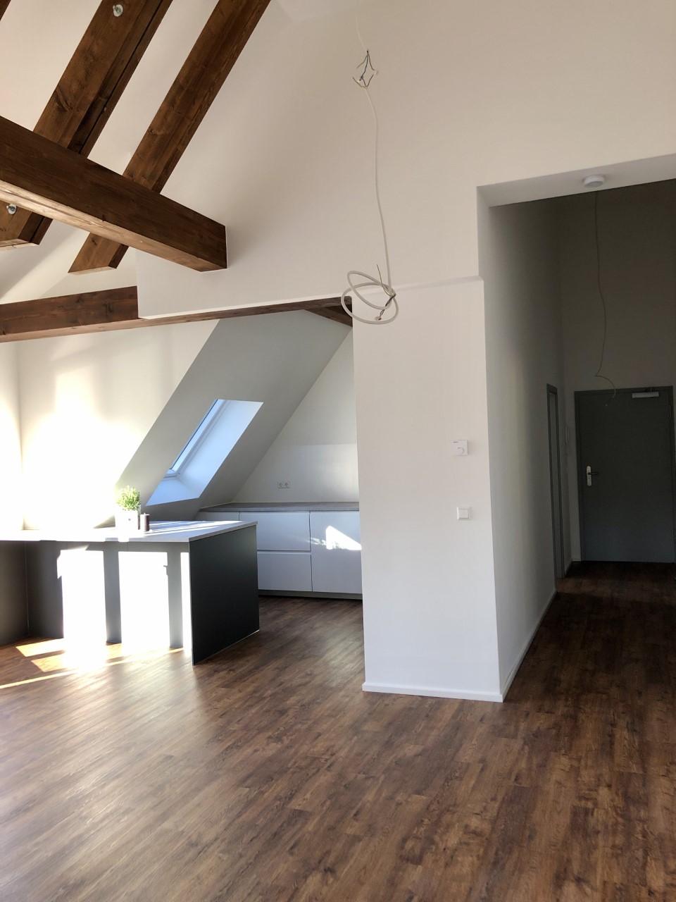 Der offene Küchen-/Wohnbereich wird durch die offenen Deckenbalken noch großzügiger. Auch im Bad mit Gaube sind die Deckenbalken sichtbar und machen den Mix aus Betonoptikfliesen und Holzoptikboden umso spannender.